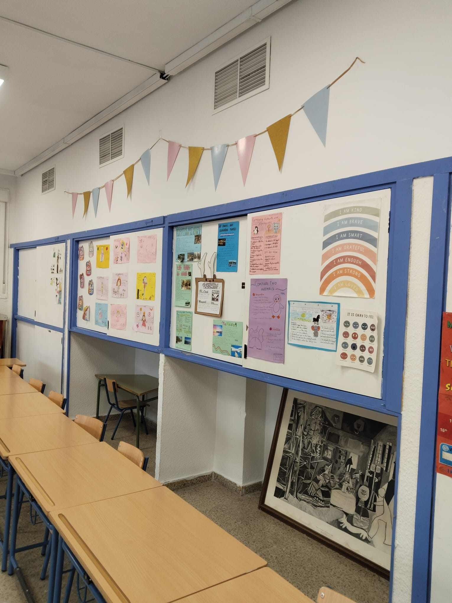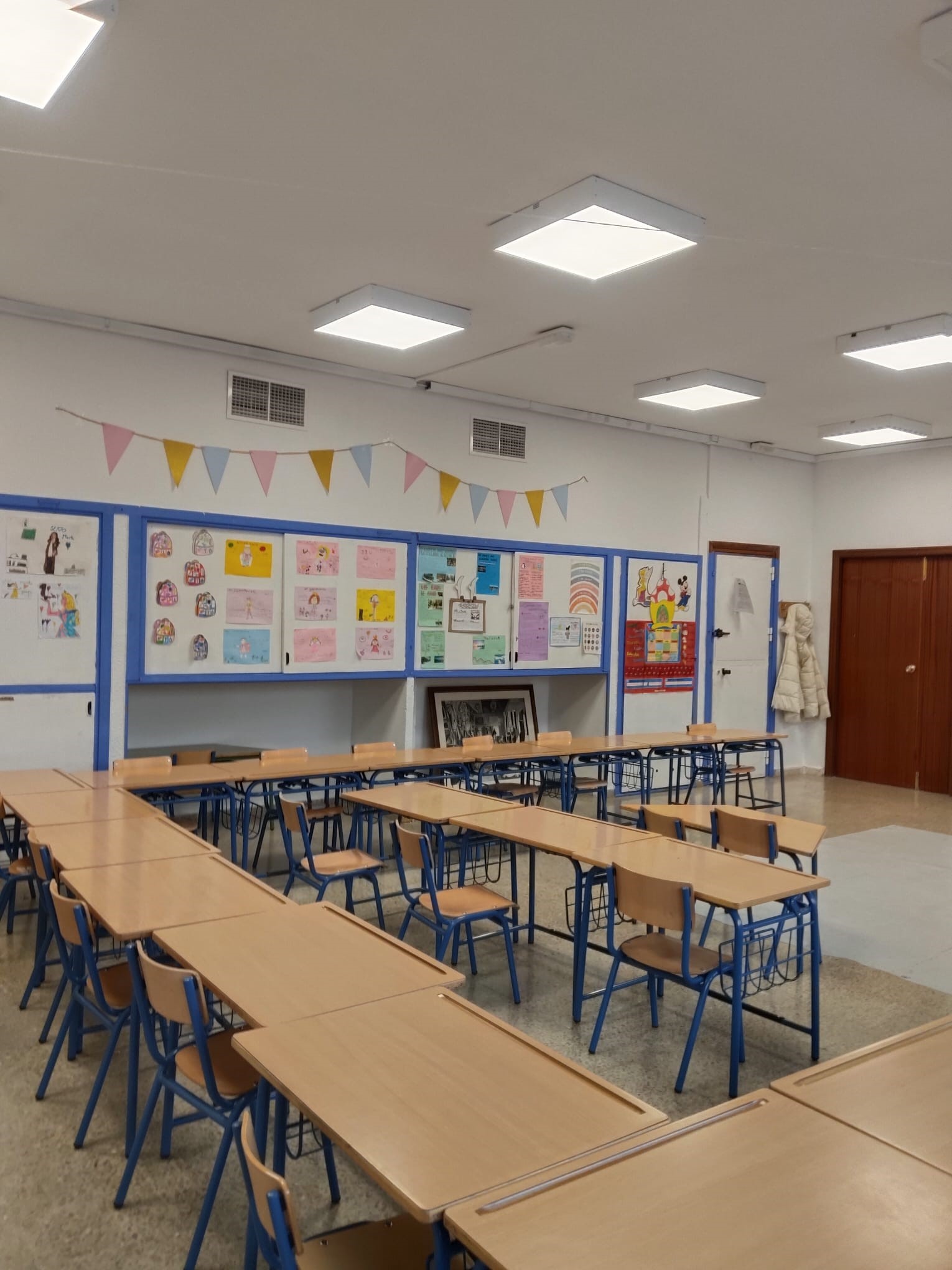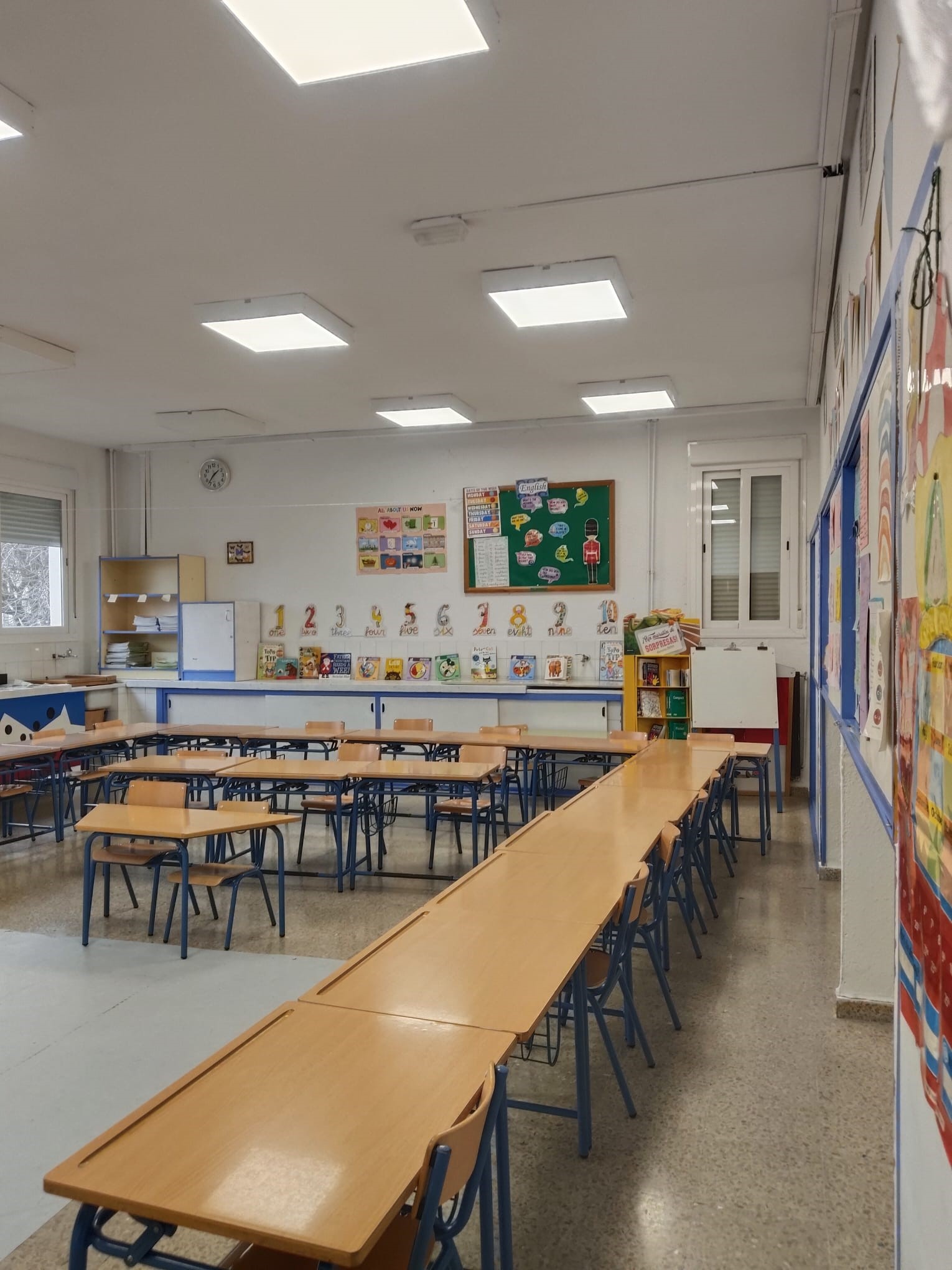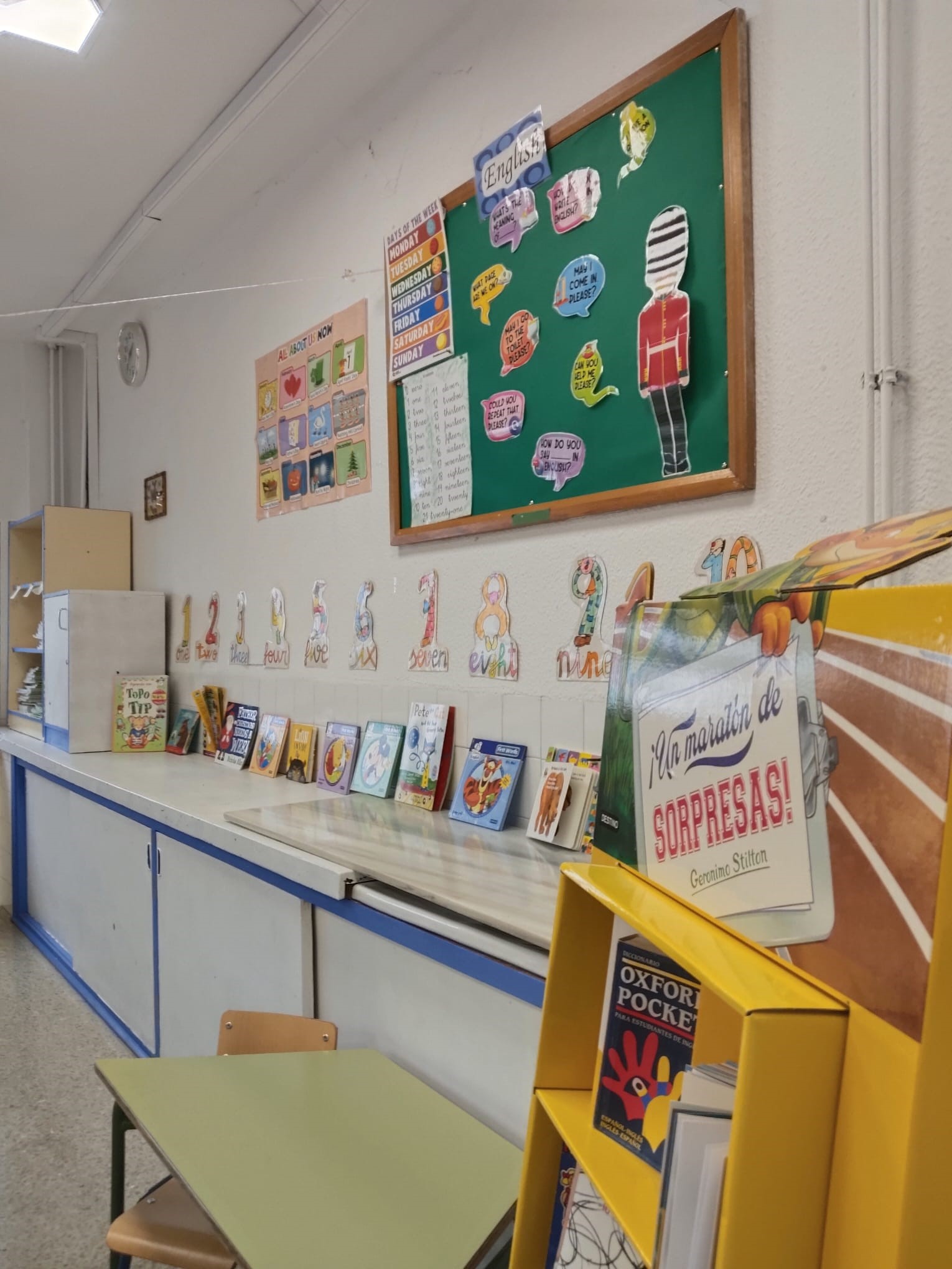 El aula de Inglés del CEIP Juan Pasquau es un espacio alegre, dinámico y lleno de estímulos visuales que invitan a sumergirse en el idioma desde el primer momento. Nada más entrar, llaman la atención los colores, los murales temáticos, las palabras clave repartidas por las paredes y los rincones llenos de materiales que hacen que aprender inglés sea algo natural y motivador.