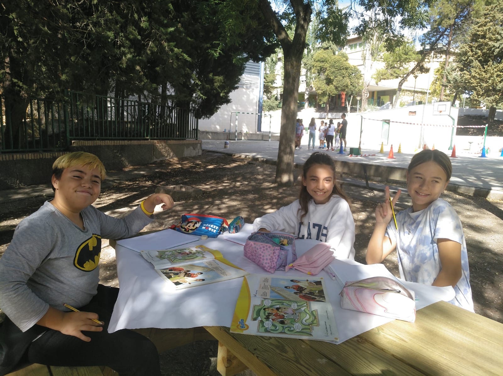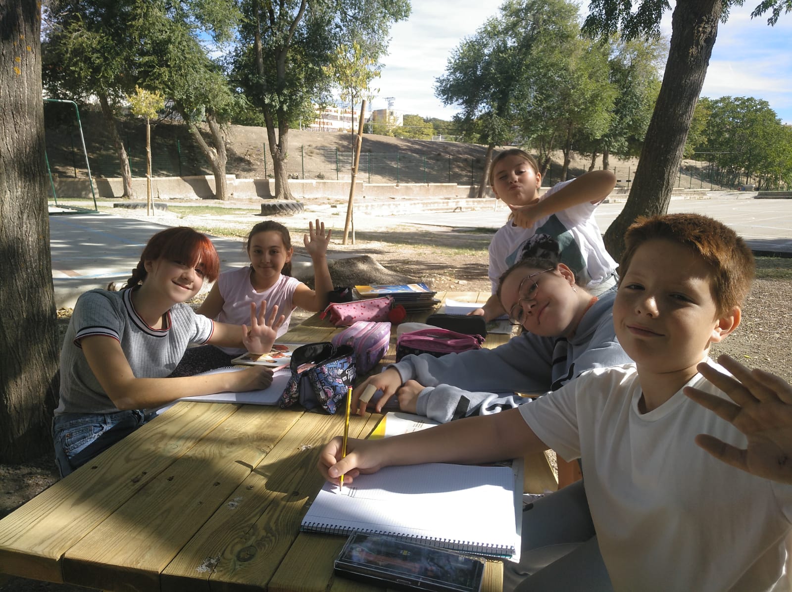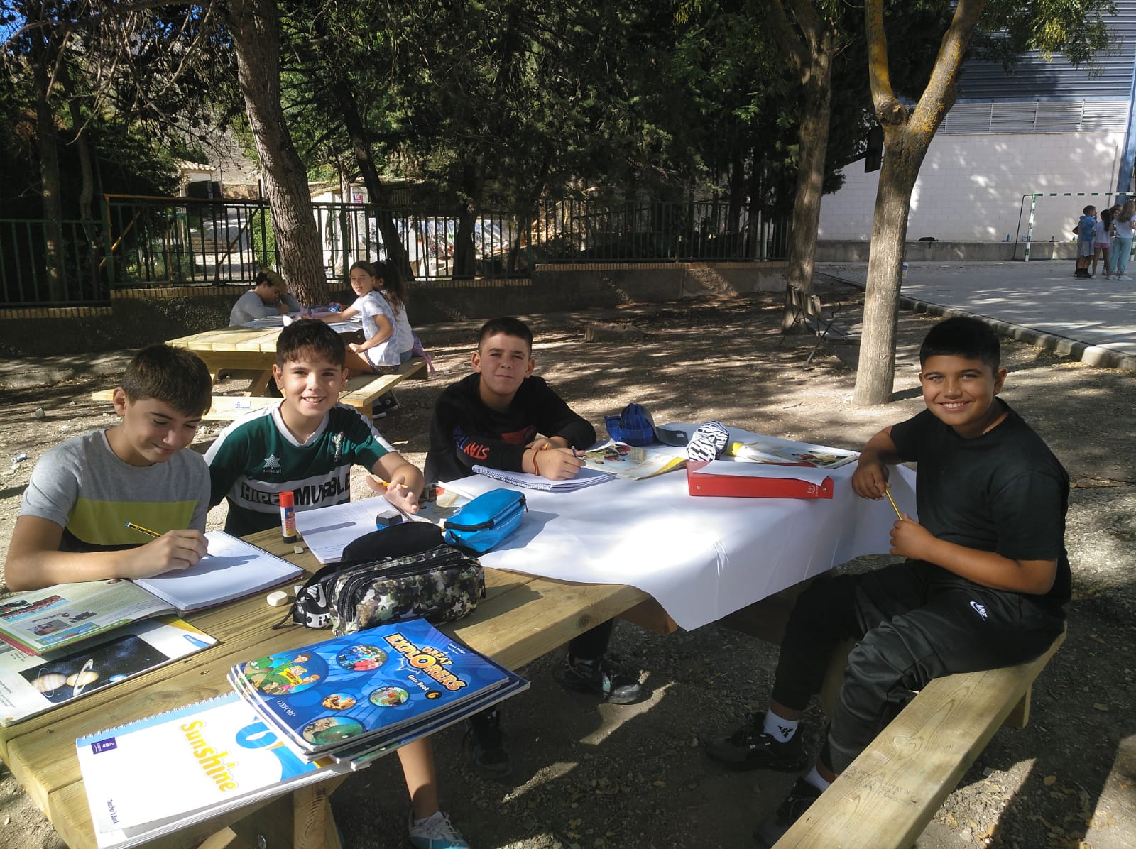 El aula de la naturaleza es uno de esos rincones del CEIP Juan Pasquau que siempre está lleno de vida. Bajo el cielo abierto, rodeado de aire fresco y con un ambiente relajado, este espacio se convierte en un lugar perfecto para dar clase de una forma diferente, más cercana y natural. Las mesas de picnic permiten trabajar en equipo, conversar, escribir, leer o realizar actividades al aire libre mientras se disfruta del entorno.
