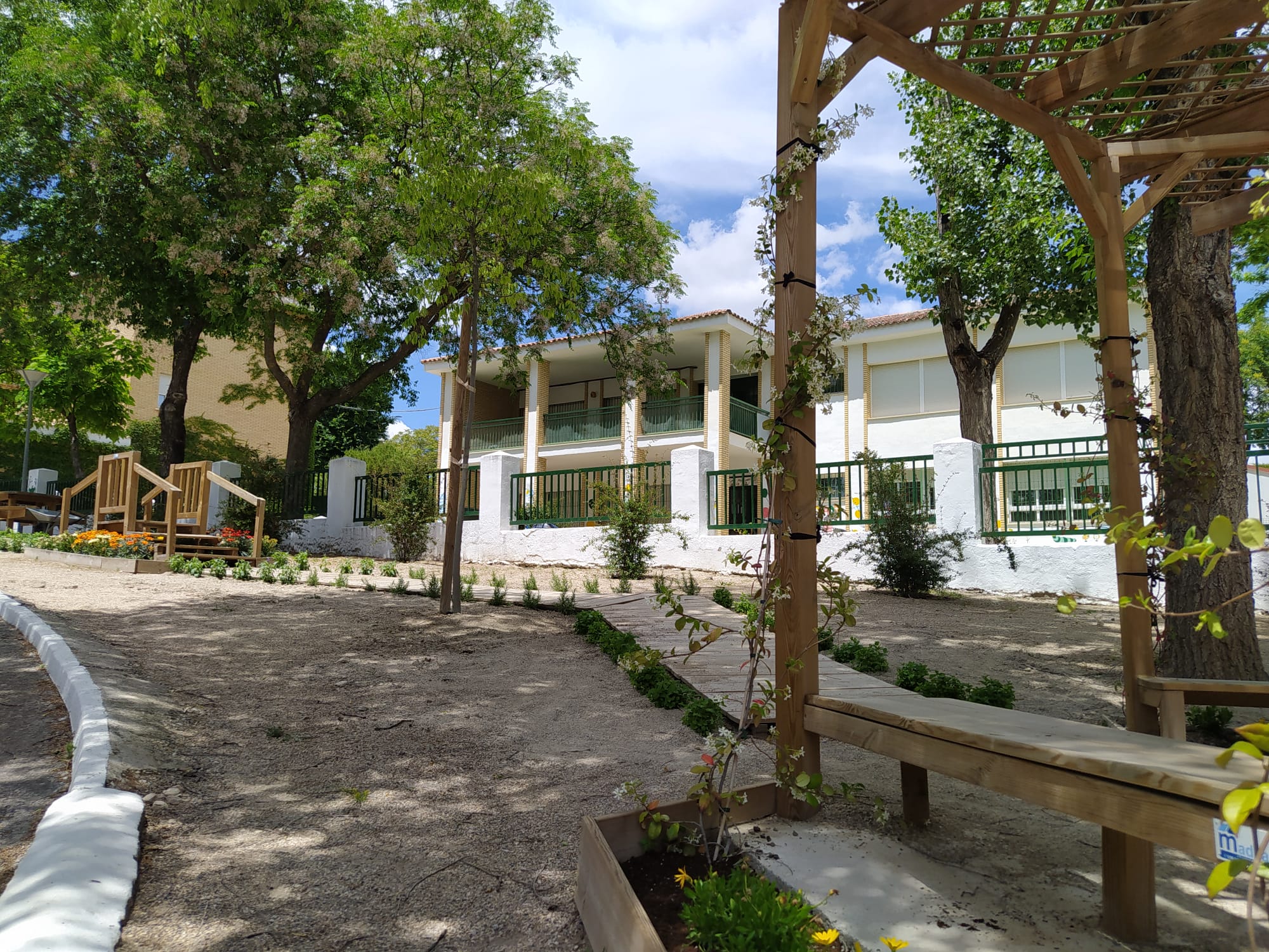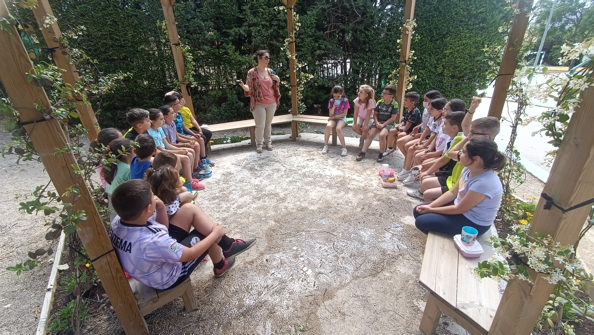 El camino termina en un precioso cenador, un círculo perfecto para sentarse a la sombra y dar clase al aire libre, viéndose las caras, conversando y compartiendo. La sombra la crean las enredaderas que trepan por las columnas, envolviendo el espacio en un ambiente fresco, acogedor y lleno de vida. Allí se leen cuentos, se hacen asambleas, se realizan actividades sensoriales o simplemente se disfruta del entorno mientras se aprende de otra manera.