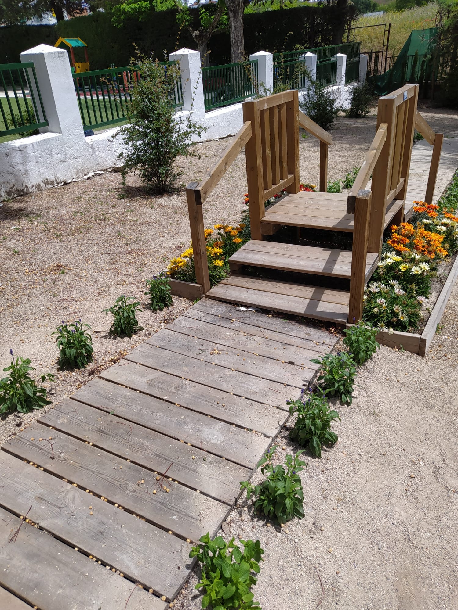 El Aula Exterior Sensorial del CEIP Juan Pasquau es uno de esos rincones que sorprenden nada más llegar. El recorrido comienza por un camino sensorial rodeado de plantas aromáticas que despiertan los sentidos: romero, lavanda, hierbabuena… Cada paso invita a oler, tocar y descubrir, convirtiendo el simple hecho de caminar en una experiencia educativa.