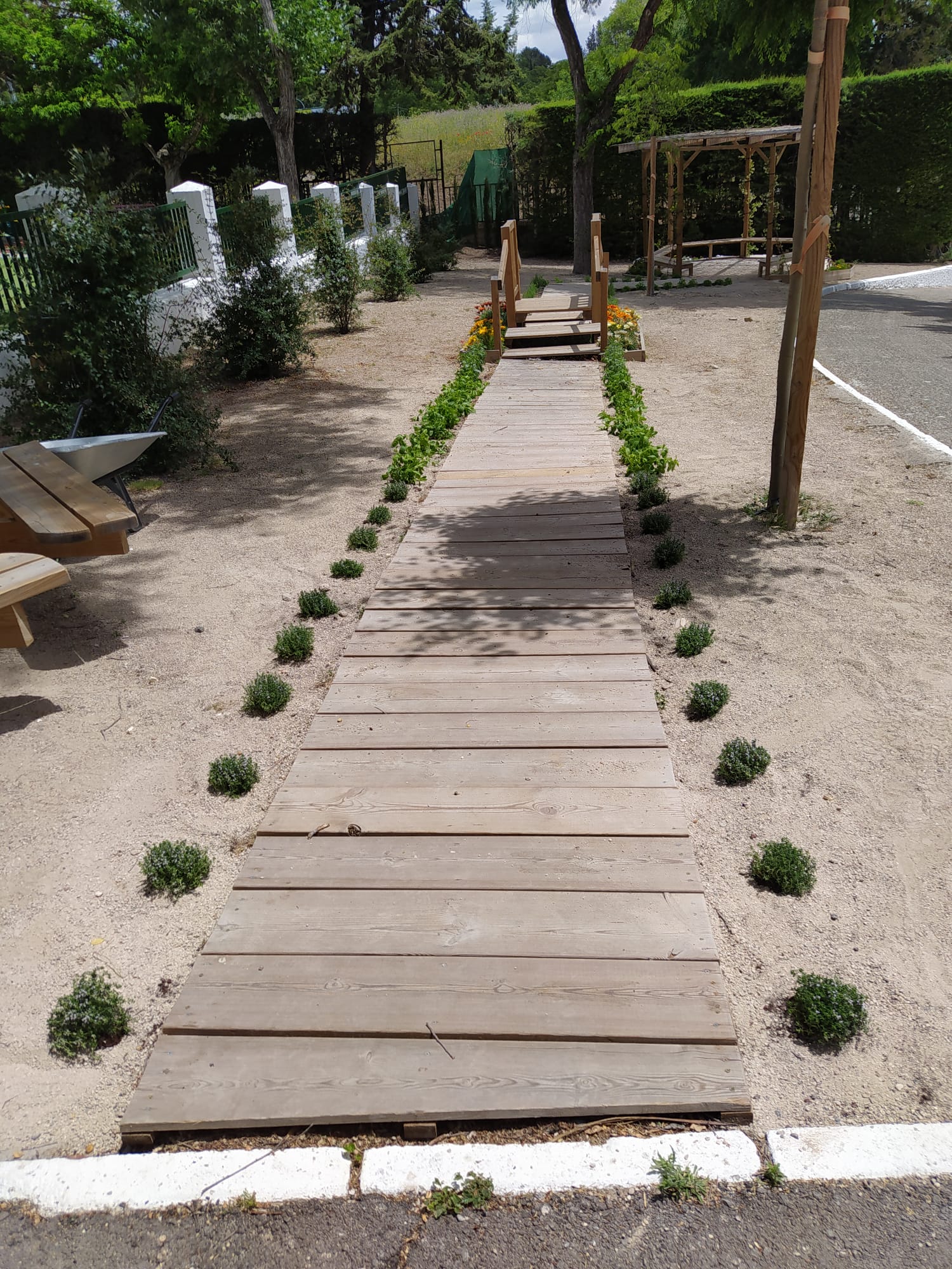 En el centro del espacio aparece un pequeño puente que añade un toque mágico al recorrido. Los pasqualines lo cruzan como si entraran en un lugar especial, un espacio donde la naturaleza y el aprendizaje se encuentran de forma natural y tranquila.