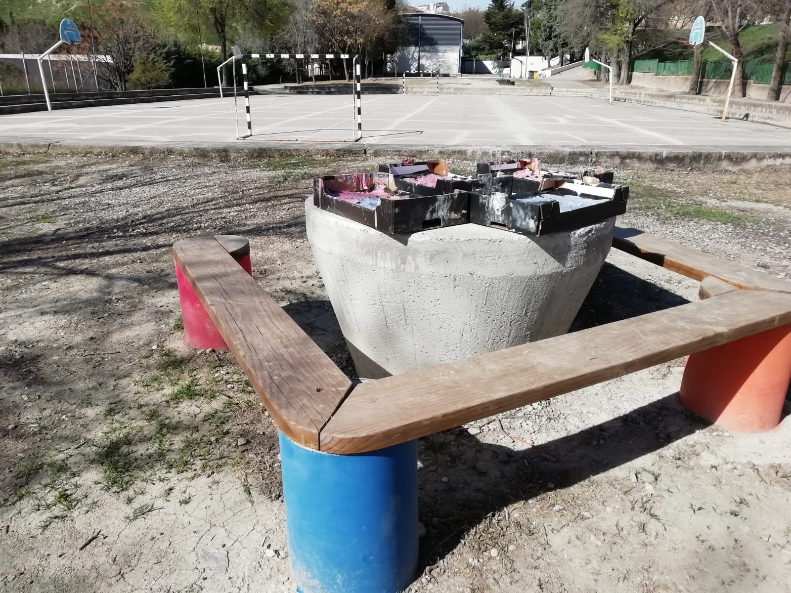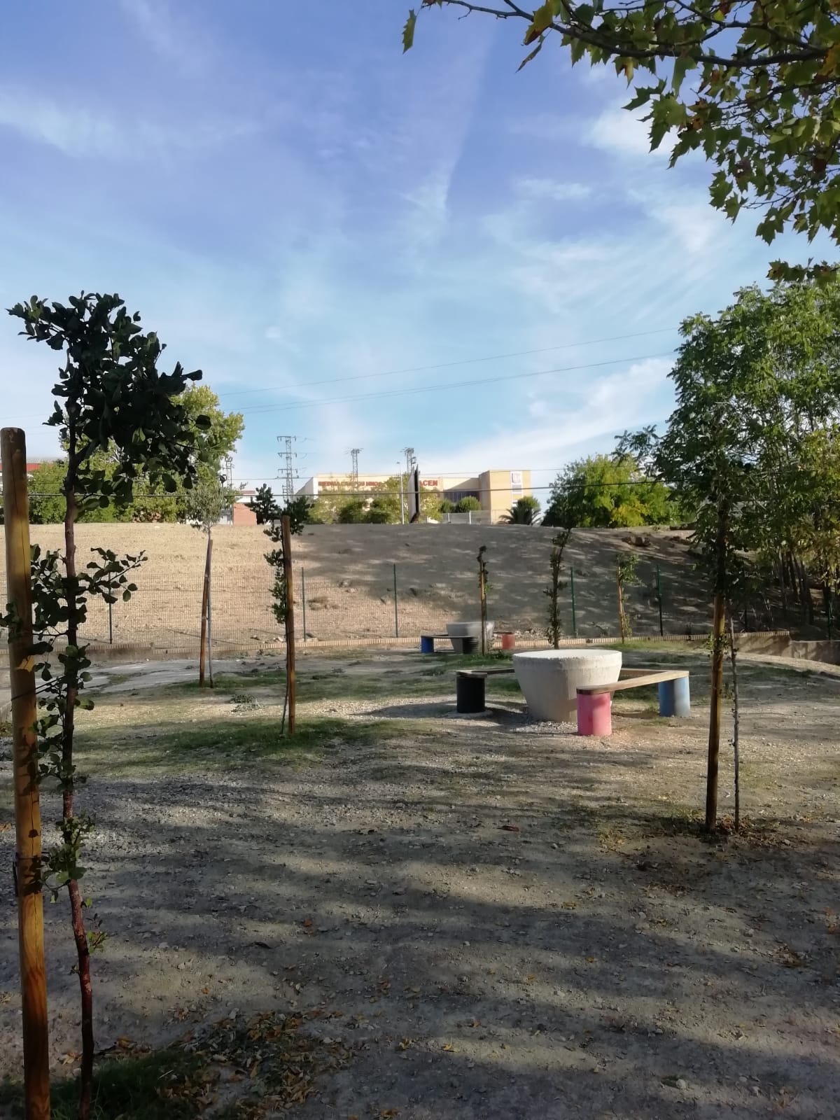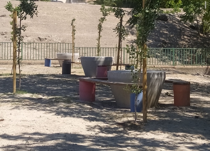 Entre los árboles se distribuyen unas mesas de obra hechas de hormigón con forma cónica, acompañadas de asientos de hormigón y madera que resultan cómodos, resistentes y perfectos para trabajar en grupo. Todo el espacio está pensado para que el alumnado pueda escribir, conversar, leer, investigar o simplemente escuchar mientras siente el aire y el sonido del entorno.