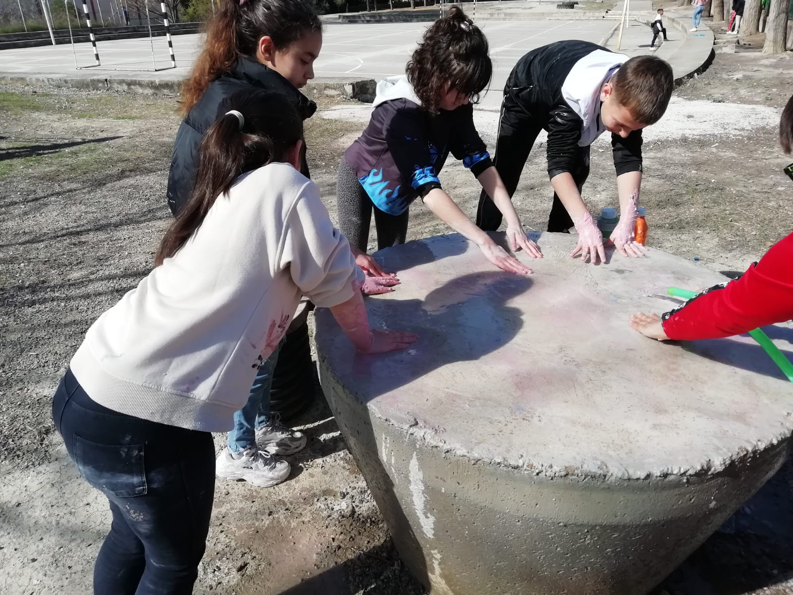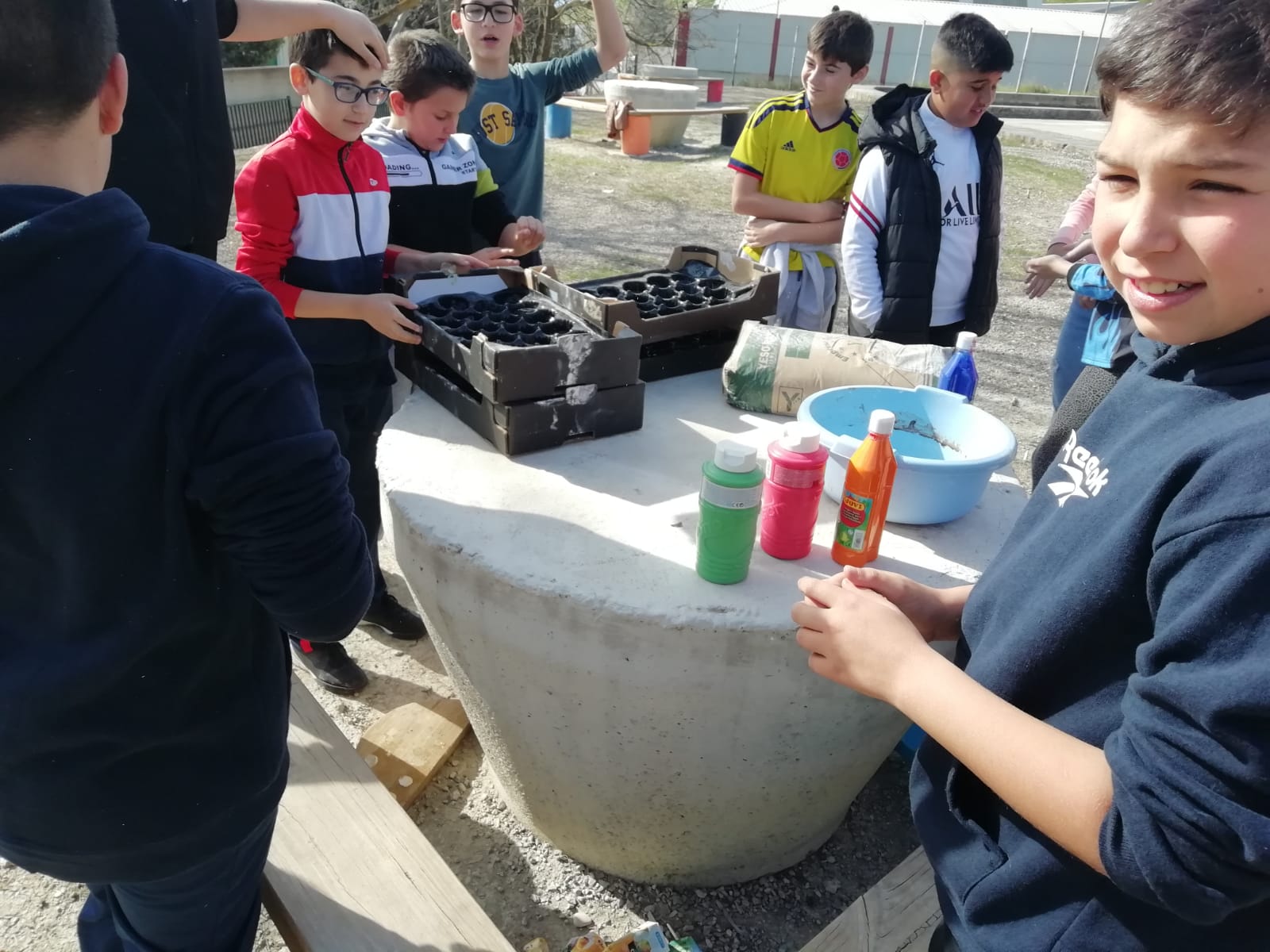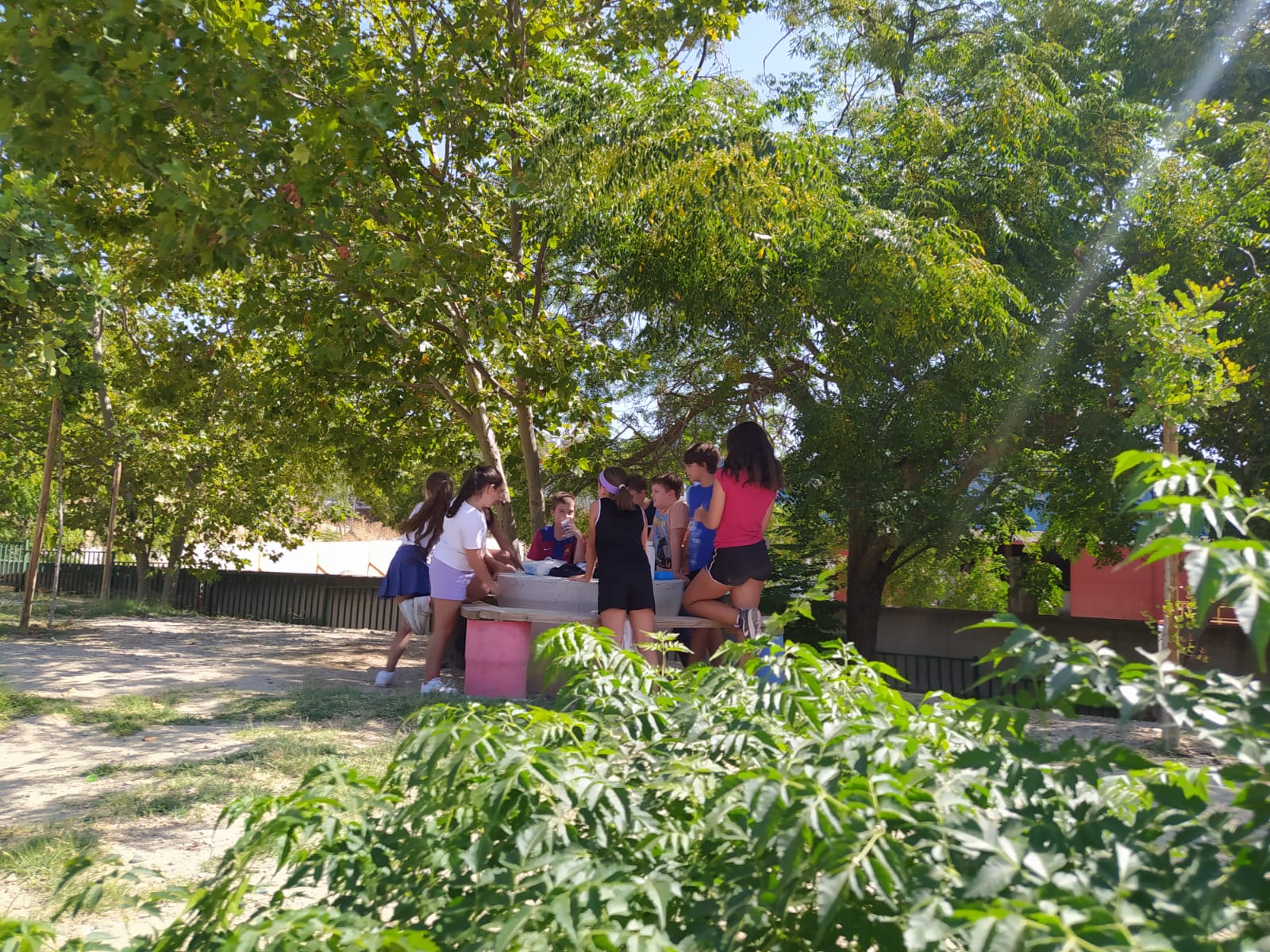 Entre los árboles se distribuyen unas mesas de obra hechas de hormigón con forma cónica, acompañadas de asientos de hormigón y madera que resultan cómodos, resistentes y perfectos para trabajar en grupo. Todo el espacio está pensado para que el alumnado pueda escribir, conversar, leer, investigar o simplemente escuchar mientras siente el aire y el sonido del entorno.